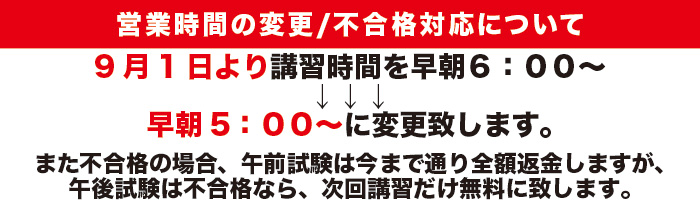 PHOTOスタッフから一言![]() 2025,09,01から午前試験のみ1回だけ不合格の場合返金になります。 午後試験の場合は1回だけ不合格の場合は次回無料になります また早朝5時からオープンしますので できるだけ早くお越し下さい |